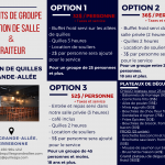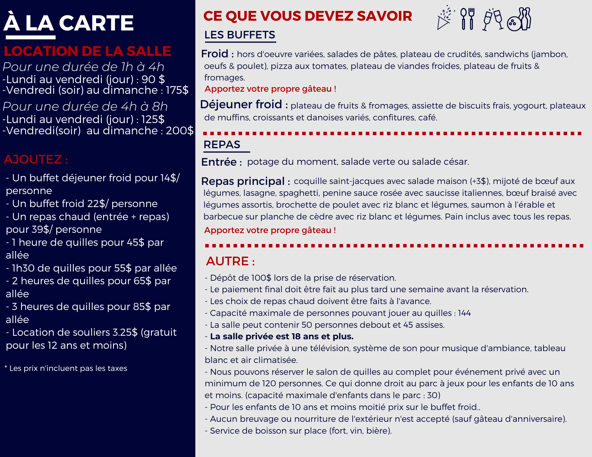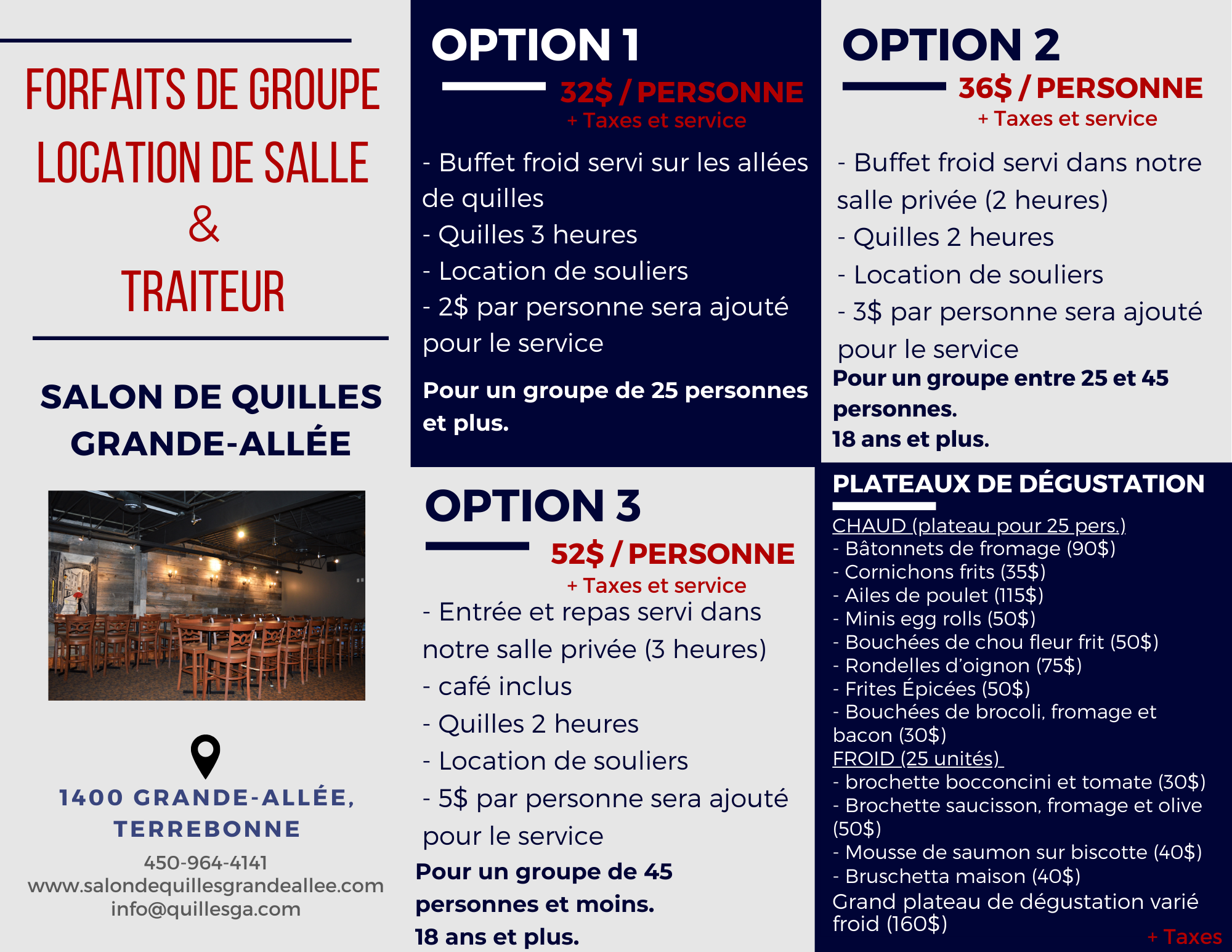 S alon de quilles Grande-Allée est l'endroit par excellence pour vos événements familiaux et corporatif ! Nous offrons plusieurs forfaits clé en main qui vous assurerons une rencontre réussie, sans les tracas. Que ce soit pour célébrer un anniversaire, fêter le temps des fêtes, pour une réunion, un 5 à 7 d'entreprise ou bien seulement pour fêter entre amis, notre salle privée est l'endroit qu'il vous faut!